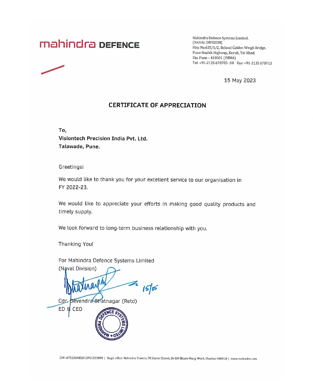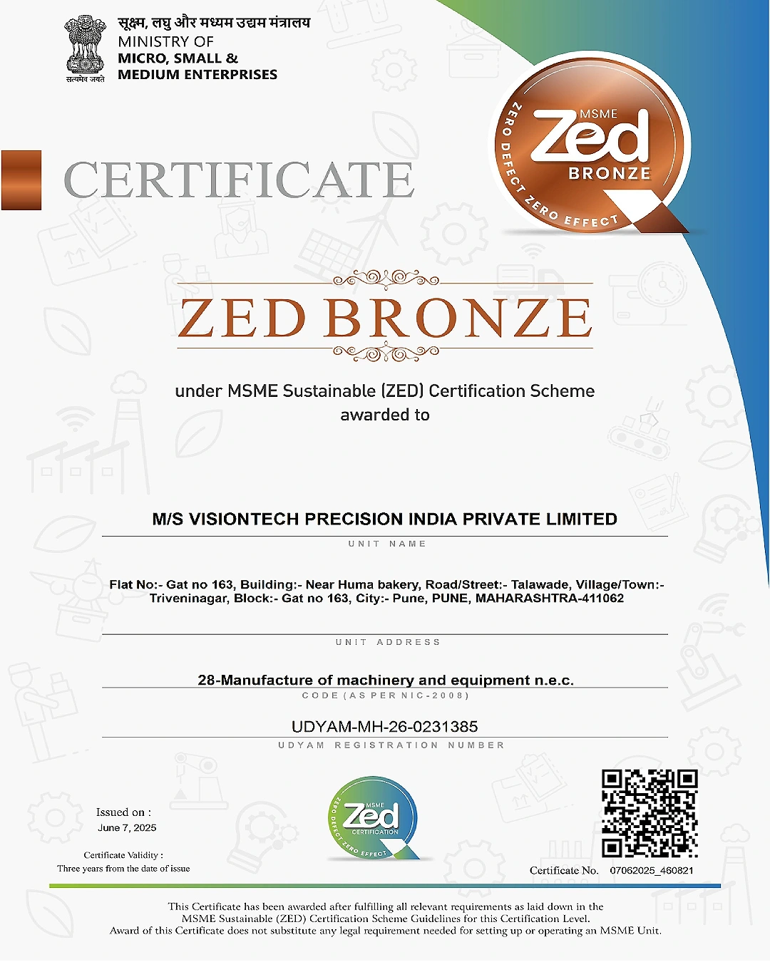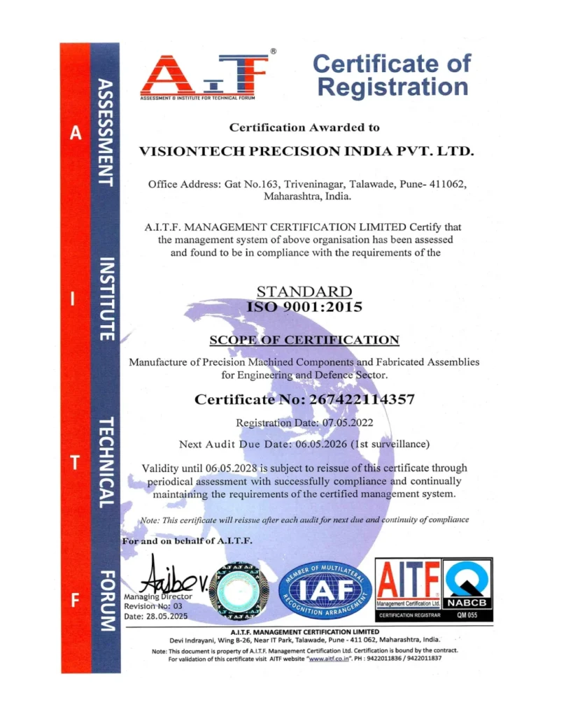 Empowering India’s Food processing & packaging machines , Defence & engineering sectors  with Precision & Innovation Visiontech Precision India Pvt. Ltd. is a high-tech engineering company based in Pune, specializing in Defence manufacturing, precision components, tooling, and fabrication. With a strong focus on quality, innovation, and reliability, we deliver high-value products made from advanced materials like stainless steel, aluminum, special alloys, and glass fibre. Backed by an ISO 9001:2015 certification, modern infrastructure, and a skilled team, Visiontech partners with leading OEMs such as Mahindra Defence, Bharat Forge, Ordnance Factory, and ARDE to provide defence-grade precision solutions that strengthen India’s industrial and national capabilities.